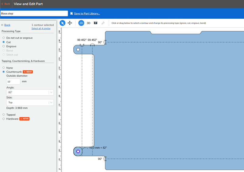 Our online DFM checker will automatically detect coutersunk features in your part model and program those holes into the production file. This technology is completely unique to OSHCut, giving engineers and organizations a serious leg up when it comes to project efficiency.