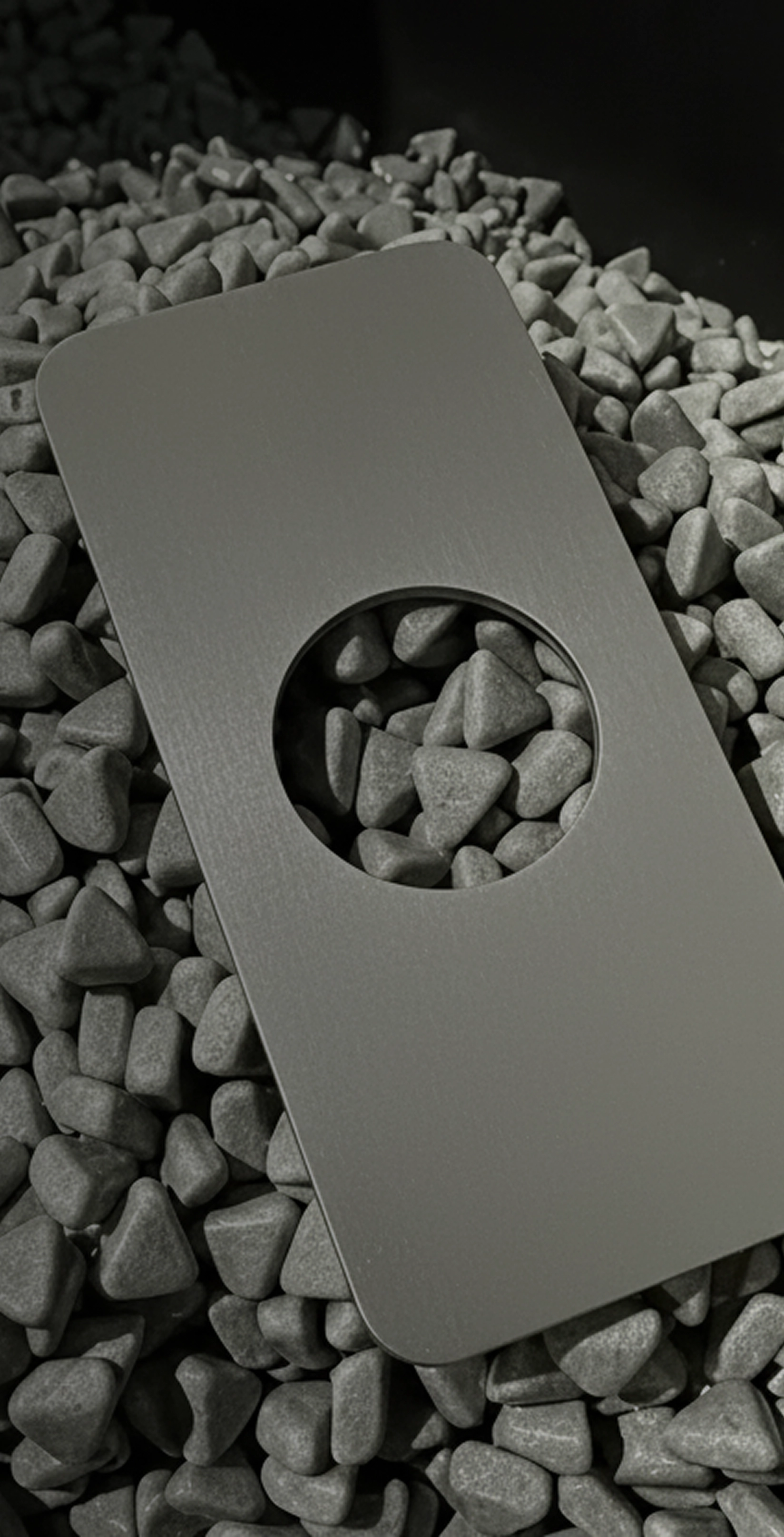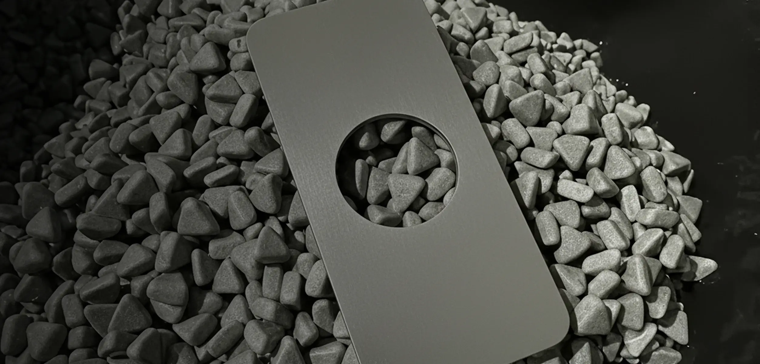 This process involves the use of abrasive media, liquid solution, and rotational speed up to 225 RPM to remove excess material (slag) from laser cutting, soften edges, and give the metal surface a uniform look.